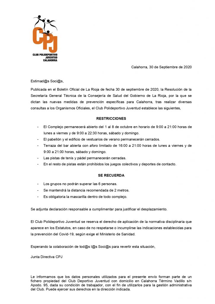 COMUNICADO CPJ 30-09-20 (RESTRICCIONES Y RECOMENDACIONES COMPLEJO DEL 1 AL 8 DE OCTUBRE)